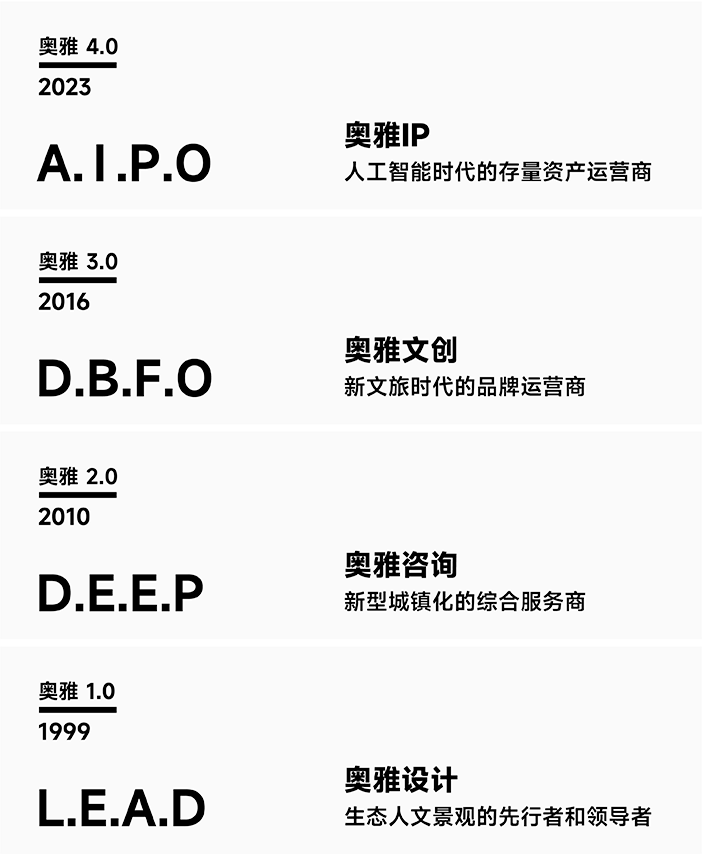 經(jīng)過多年的戰(zhàn)略布局與發(fā)展,在李方悅女士的推動下,奧雅股份從一家設計企業(yè)成功轉(zhuǎn)型成為新銳的輕資產(chǎn)文旅開發(fā)運營企業(yè)。奧雅以“創(chuàng)造更美好的人居環(huán)境”“讓空間賦予生命”為使命,以雙輪驅(qū)動+雙引擎為發(fā)展格局,即創(chuàng)意設計+親子文旅雙輪驅(qū)動、AIGC+IP雙引擎;經(jīng)營業(yè)務范圍涵蓋創(chuàng)意設計、親子文旅、數(shù)字科技等領域,為城市更新、鄉(xiāng)村振興、文化古城等不同場景提供全程化咨詢與綜合運營服務。在實現(xiàn)企業(yè)價值和理想的同時,解決當代中國的實際問題與需求,創(chuàng)造具有地域特色、人性化和充滿活力的新舊城市空間和綜合文化旅游項目。
